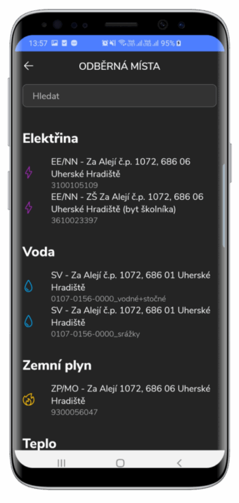 Spotřeby a náklady za všechny druhy energií (EnPI, fakturované i vlastní odečty, energie u nájmů).